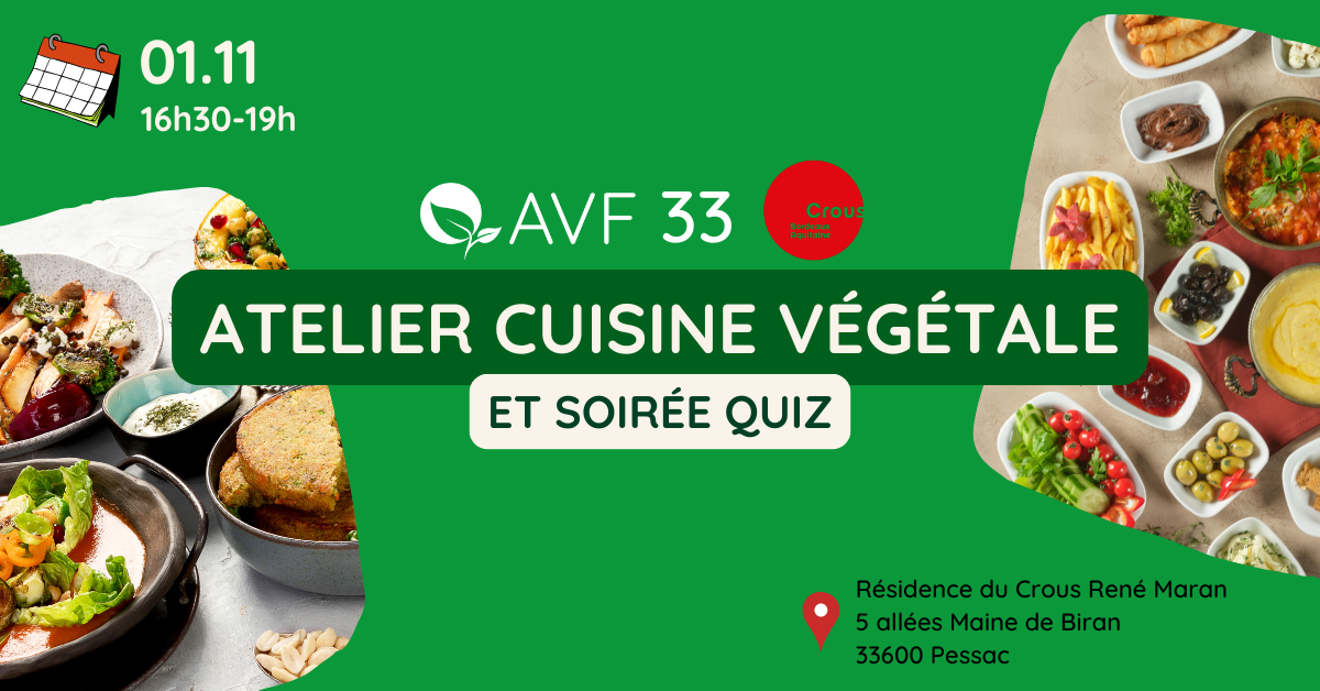 Dans le cadre de la Journée Mondiale du Véganisme et en partenariat avec le Crous Bordeaux Aquitaine, les bénévoles du groupe local 33 de l’AVF vous proposent un atelier de cuisine végétale.