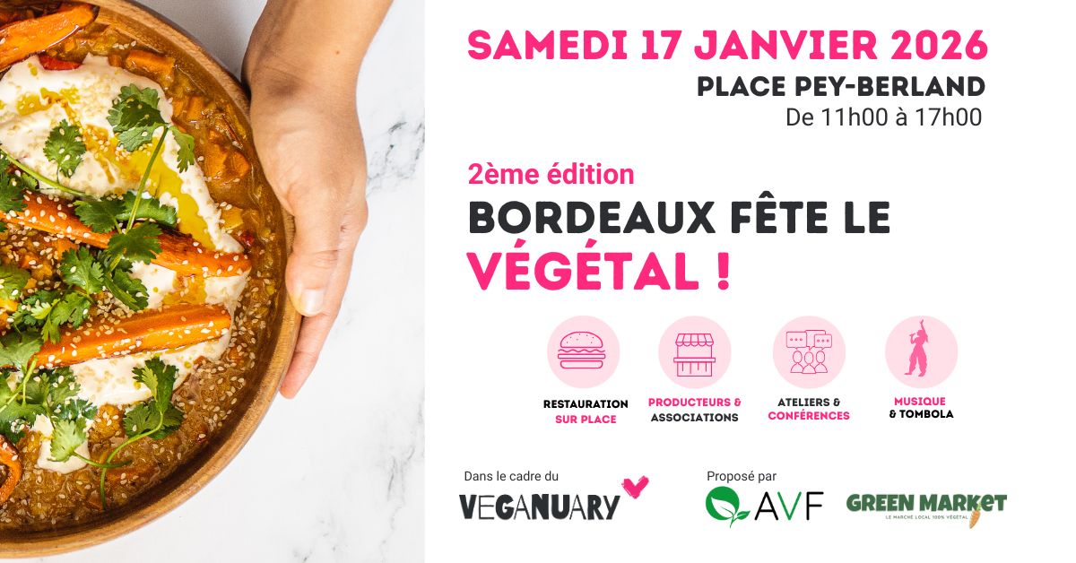 Le groupe local Gironde de l’AVF et le Green Market vous proposent de vous retrouver samedi 17 janvier de 11h à 17h sur la place Pey Berland à Bordeaux pour fêter le végétal et le Veganuary.