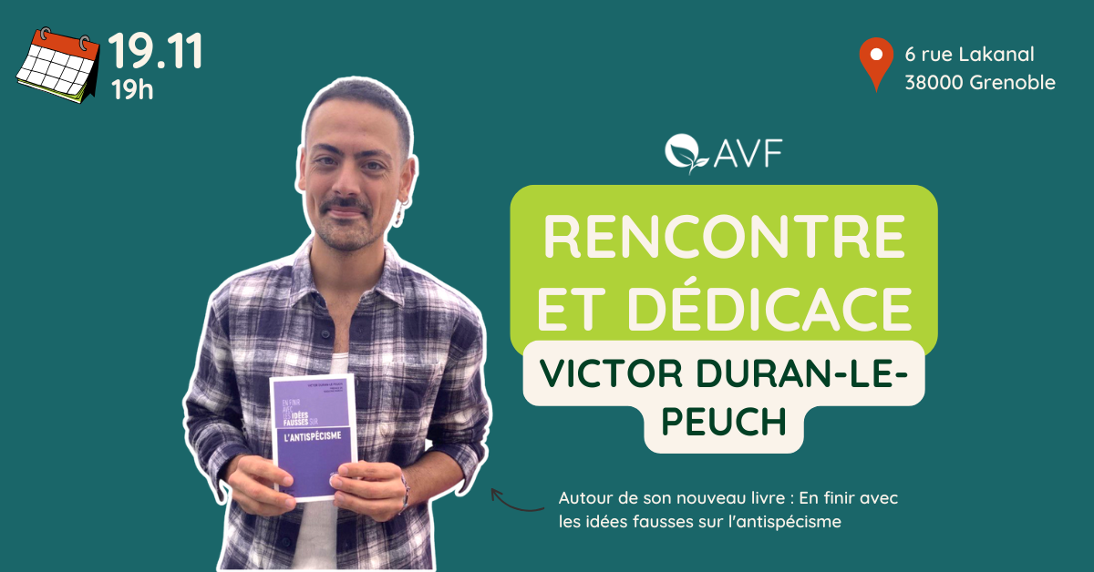 Une fois n’est pas coutume : nous vous faisons part d’un évènement qui n’est pas porté par l’AVF38, mais auquel nous nous associons volontiers : la venue de Victor Duran-Le-Peuch à la librairie grenobloise Les Modernes* pour la sortie de son livre En finir avec les idées fausses sur l’antispécisme, paru aux éditions L’Atelier.