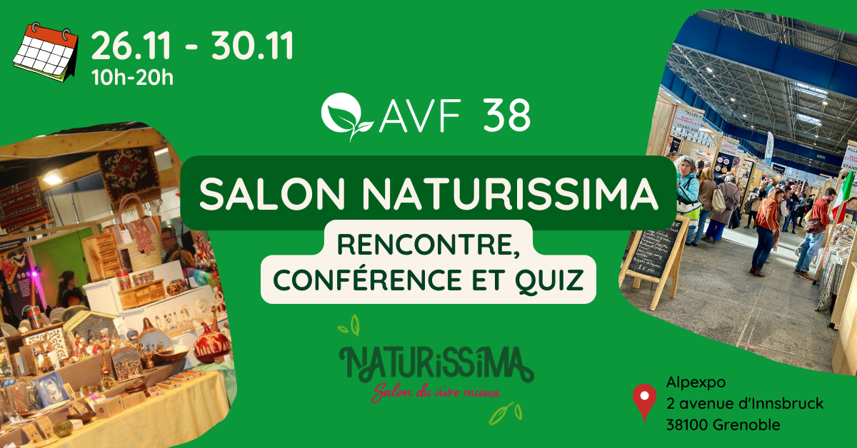 🥁 À noter dans votre agenda ! : du 26 au 30 novembre, l’équipe de l’AVF38 sera à nouveau présente à Alpexpo où elle tiendra un stand pour le Salon du vivre mieux Naturissima et répondra à toutes vos questions sur l’alimentation végétale 🌱
