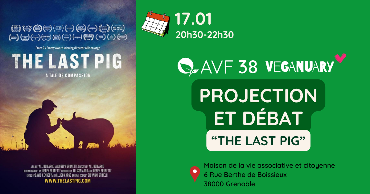 ☞ Un rendez-vous exceptionnel, le 17 janvier, à 20h30 à la Maison de la Vie Associative et Citoyenne de Grenoble* : la projection du film The Last Pig d’Allison Argo, suivi d’un échange avec Virginie Sabourin — fondatrice du Réseau des Refuges Animalistes — , Virginia Markus — fondatrice de l’association Co&xister — et Soizic, ancienne employée agricole.