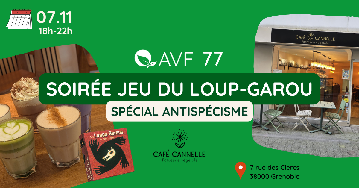 Alors rejoignez Célia, Théo et Maksen, notre équipe de jeunes bénévoles dynamiques, le vendredi 07 novembre au Café Cannelle, pour une partie de loup-garou conviviale, sur le thème de l’antispécisme et de l’alimentation végétale… 🌱