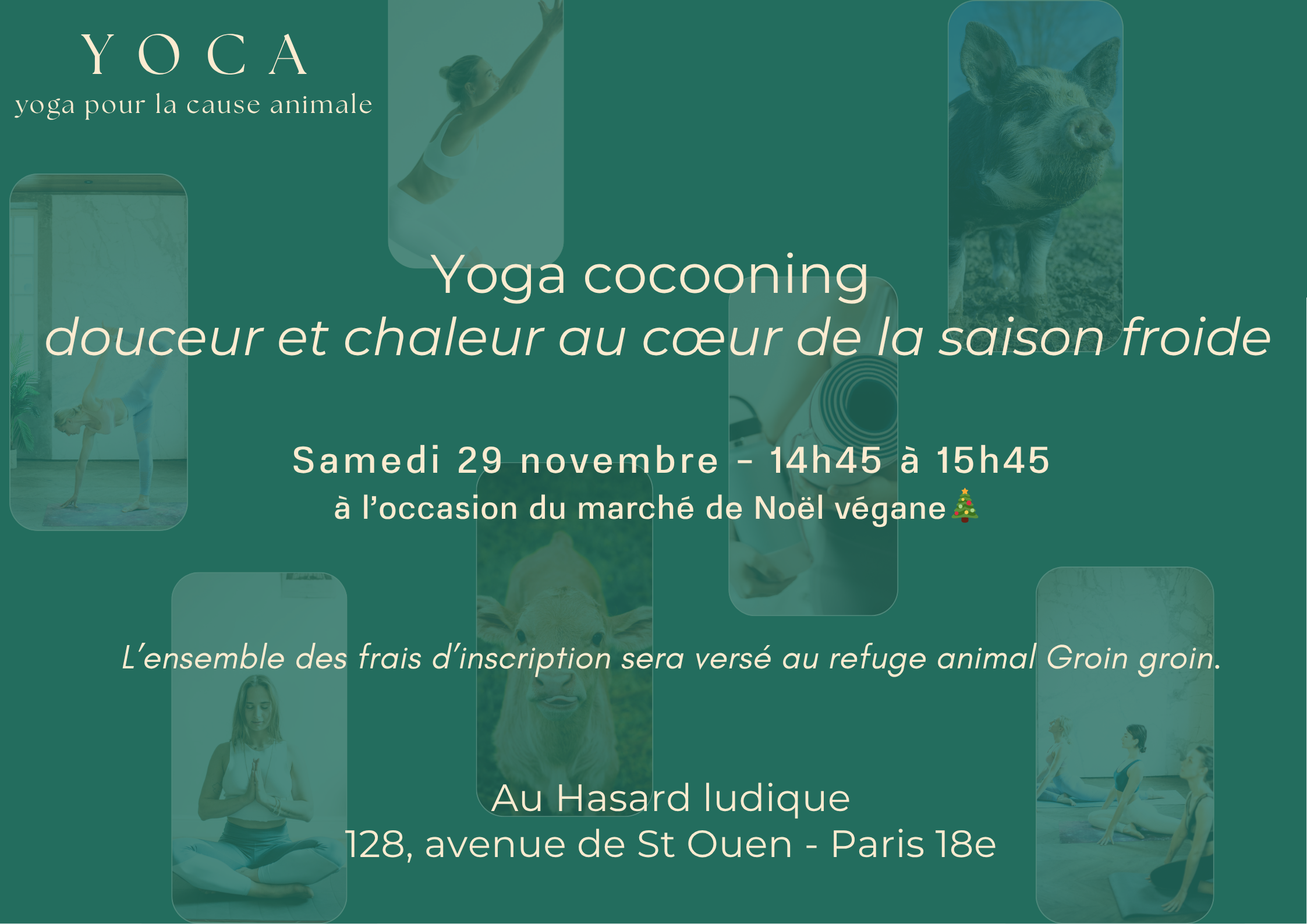 YOCA, le yoga pour la cause animale, te donne rendez-vous le samedi 29 novembre à 14h45 dans le cadre du marché végane du Hasard Ludique (Paris 18) ! Viens nous rejoindre pour une séance de yoga d’une heure placée sous le signe du cocooning et de la chaleur intérieure. La séance est accessible sur donation à un organisme œuvrant pour la cause animale : le refuge Groin groin, refuge pour cochons & animaux de ferme.